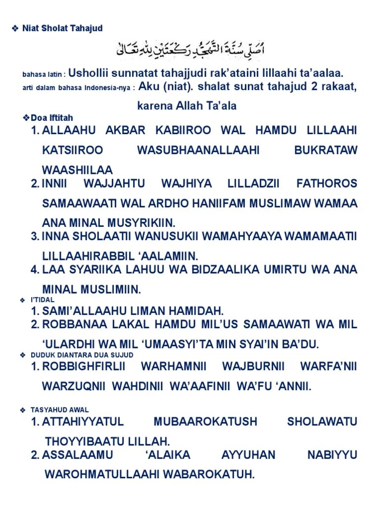 Bacaan doa iftitah pada shalat tahajud 1. Doa iftitah dibaca setelah takbiratul ihram. Ibadah sholat juga akan diawali dengan takbiratul ihram dengan mengangkat kedua tangan. أَنْتَ تَحْكُمُ بَيْنَ عِبَادِكَ فِيْمَا كَانُوْا فِيْهِ يَخْتَلِفُوْنَ. Setelahnya akan disambung membaca doa iftitah. Bacaan doa iftitah lengkap arab, latin, dan terjemahan bahasa indonesia akan tersaji di akhir artikel. Setelah membaca doa iftitah dan alfatihah, bacalah surat atau ayat tertentu. Bacaan doa iftitah hukumnya sunnah baik saat mengerjakan shalat wajib maupun sholat sunnah. Aku niat sholat sunnah tahajud dua rakaat (dengan menghadap kiblat) karena allah taala. 2. Mengenai pertanyaan kedua tentang bacaan dalam shalat tahajud, termasuk bacaan doa iftitah yang digunakan dalam shalat tahajud. Membaca ayat atau surat tertentu hukumnya adalah sunnah. Doa iftitah adalah doa yang dibaca pada awal shalat baik wajib maupun shalat sunnah, doa ini dibaca bersamaan dengan takbiratul ihram yang pertama, . Berkaitan dengan bacaan doa dalam shalat iftitah, bisa dilihat di dalam buku tuntunan ramadhan yang ditulis oleh majelis tarjih dan .